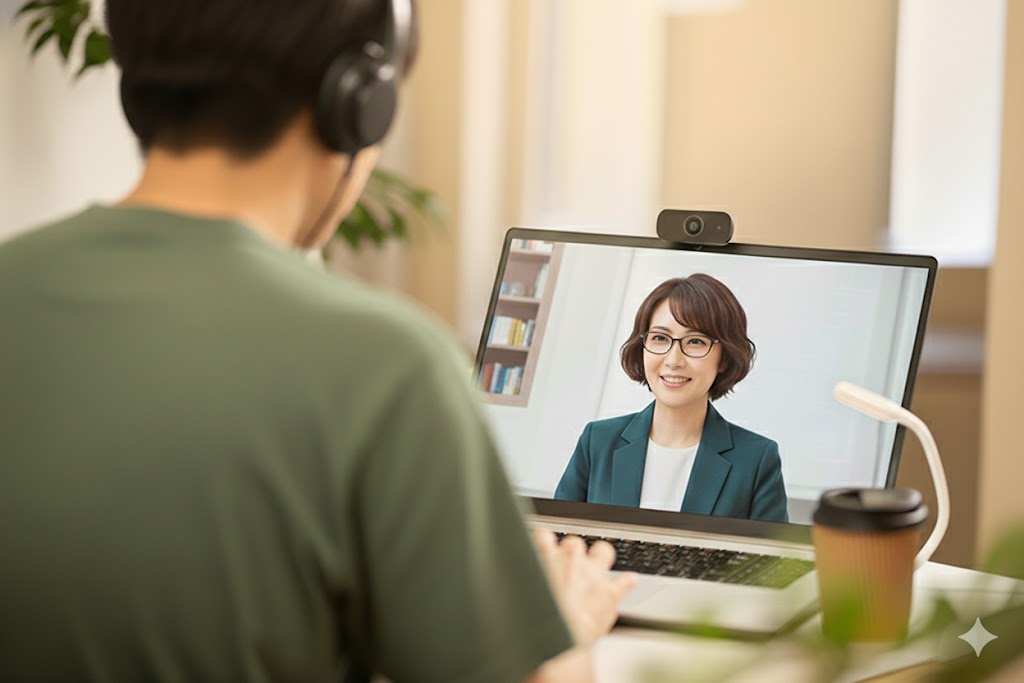 1〜2ヶ月ごとに全3回、専門資格を持つキャリアコンサルタントとオンライン面談を行い、自身の適性や強みを整理しながら、目指すキャリアを言語化していく時間です。訓練期間中の方向性確認と就職準備をサポートします。